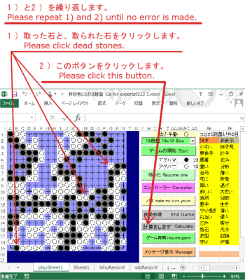 取れている石や取られているをクリックし、計算します。 Please click dead stones and judge the game.