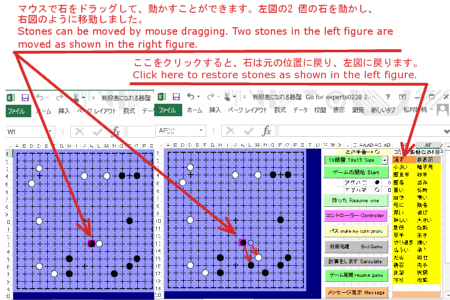 下図のように、石をマウスでドラッグして移動することができます。 元に戻すときは、"消す"をクリックします。 Stones can be moved by mouse dragging. Click "消す" as shown below to restore them.