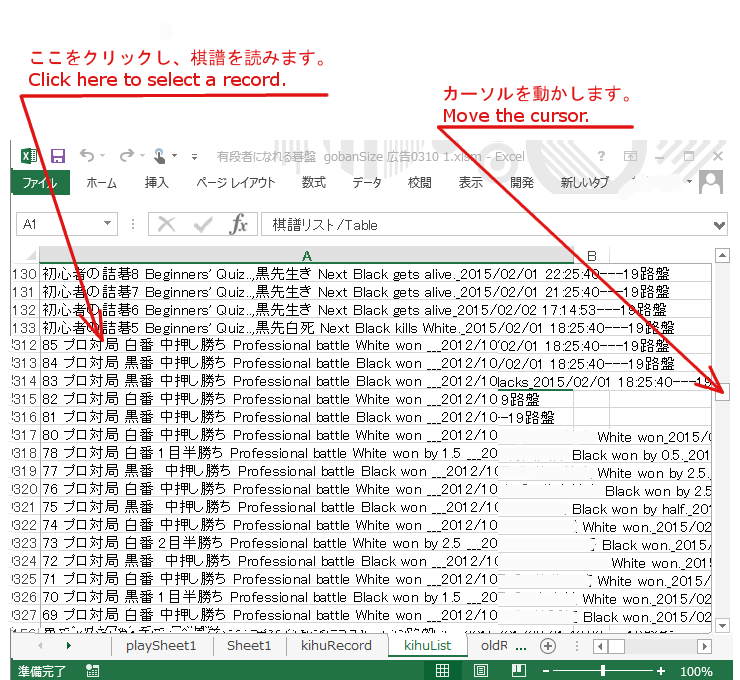下図に示すカーソルを上下させて、「(COM)黒番 xxxxx 白番 yyyyy」の 棋譜をクリックします。COMが付いている棋譜はコメント付きです。 Please click the button shown in the figure below and click a record 「(COM)黒番 xxxxx 白番 yyyyy」while moving the cursor. The COM shows that the record is with comments.