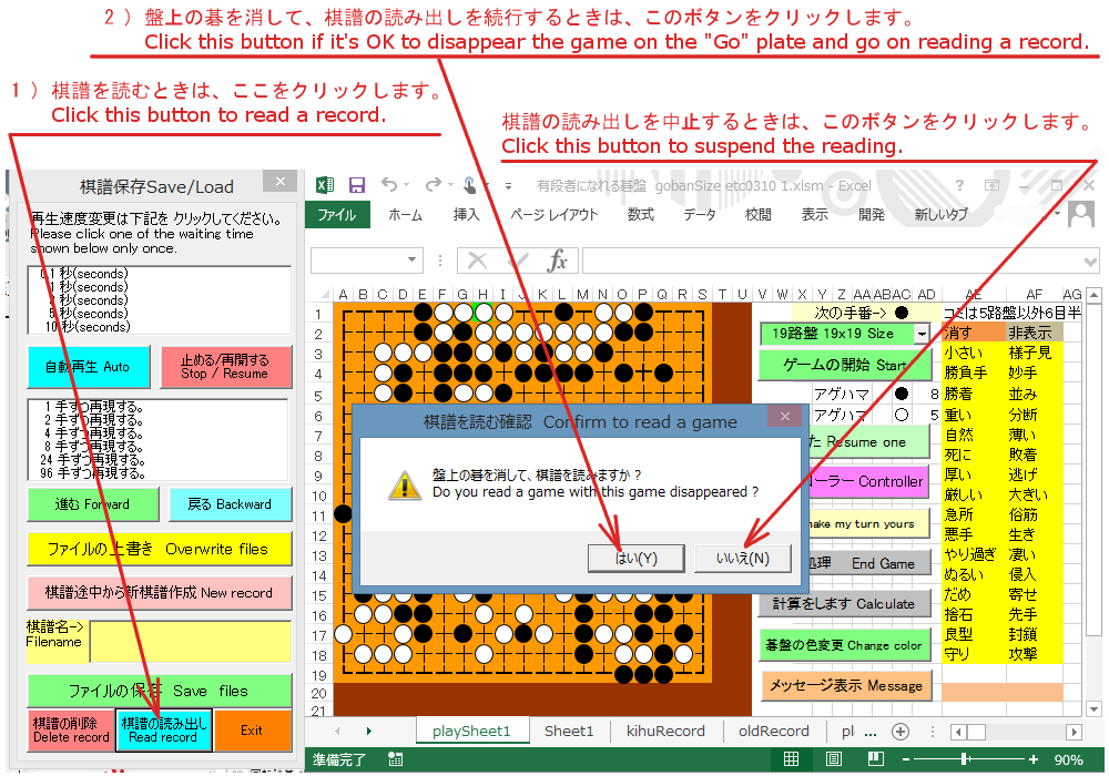 下図に示す"棋譜の読み出し"ボタンをクリックします。 盤上の碁を誤って消さないように、"はい(Y)" ボタンのクリックが必要です。